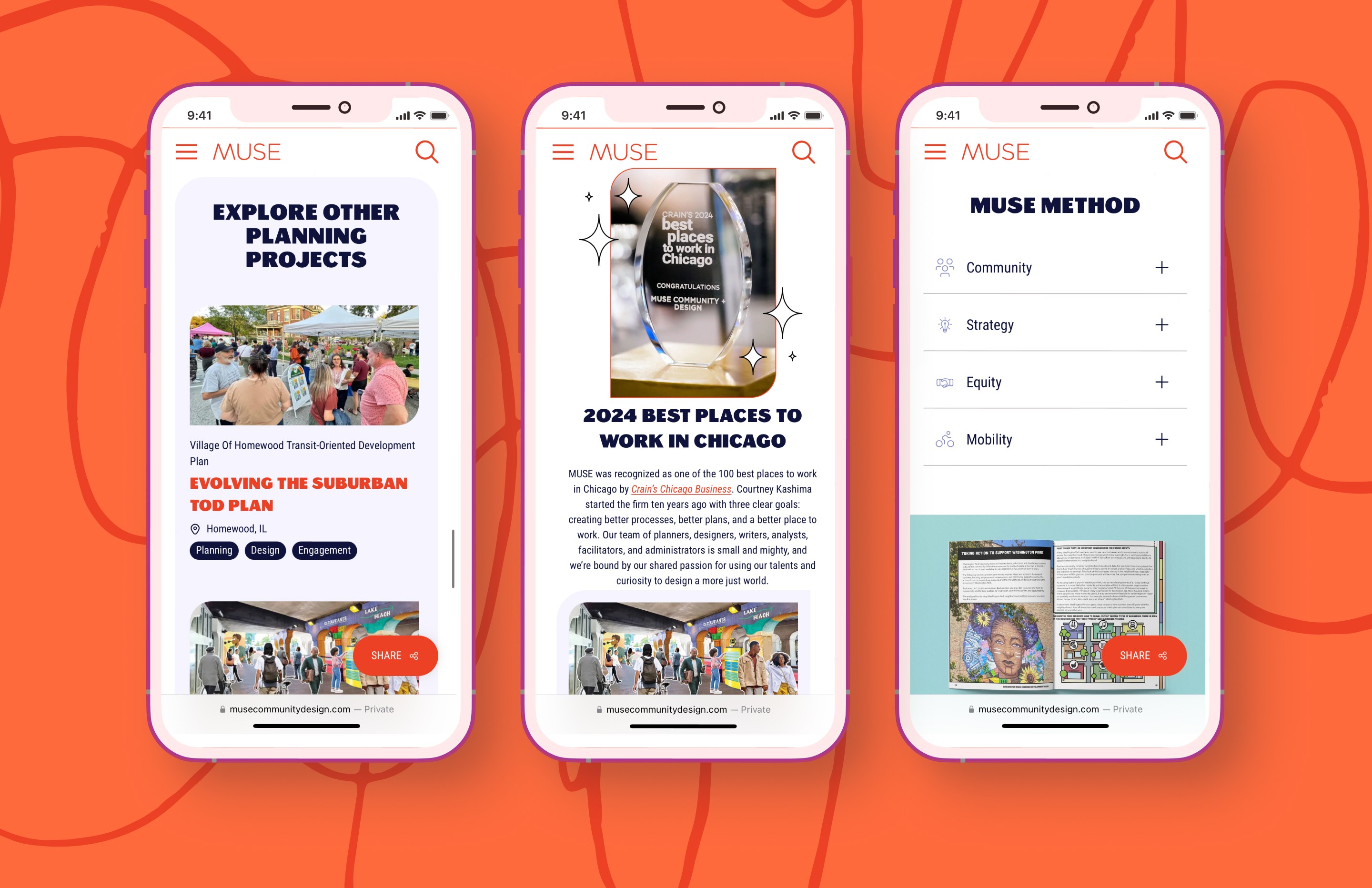 The final website launched on schedule, giving MUSE a platform that not only looked polished and professional but also fully embodied their creative, community-driven approach. By combining careful planning, rapid iteration, and playful, thoughtful design touches, we delivered a website that supported the firm's mission, highlighted their latest projects, and made a strong impression at the conference.